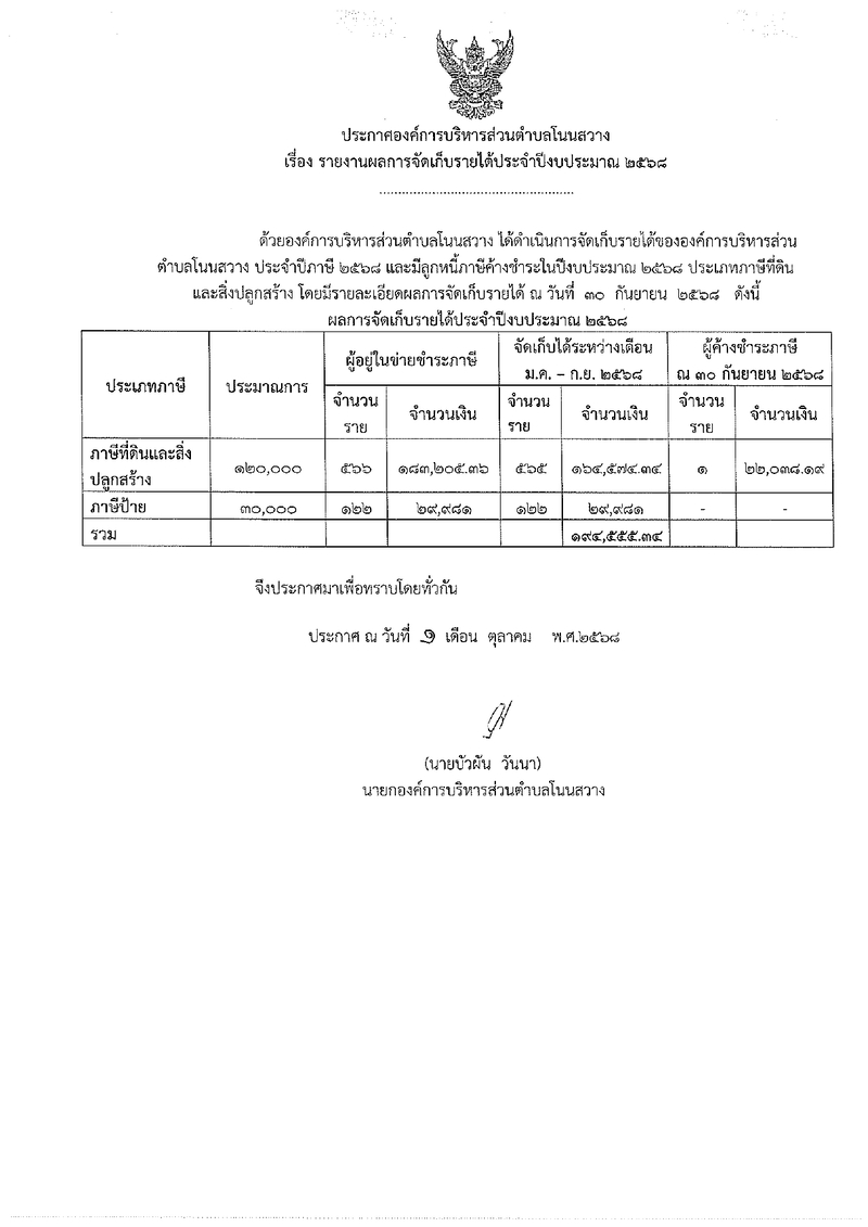 รายงานผลการจัดเก็บรายได้ประจำปีงบประมาณ 2568 วันจันทร์, 06 ตุลาคม 2568 10:02 Print Email ประกาศองค์การบริหารส่วนตำบลโนนสวาง เรื่อง รายงานผลการจัดเก็บรายได้ประจำปีงบประมาณ 2568 รายละเอียดตามเอกสารที่แนบมาพร้อมนี้ back to top