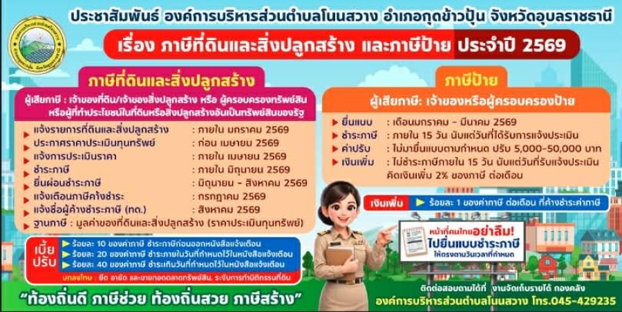 ประชาสัมพันธ์ เรื่อง ภาษีที่ดินและสิ่งปลูกสร้าง และภาษีป้าย ประจำปี 2569 วันจันทร์, 02 กุมภาพันธ์ 2569 16:41 Print Email ประชาสัมพันธ์ เรื่อง ภาษีที่ดินและสิ่งปลูกสร้าง และภาษีป้าย ประจำปี 2569 Media back to top